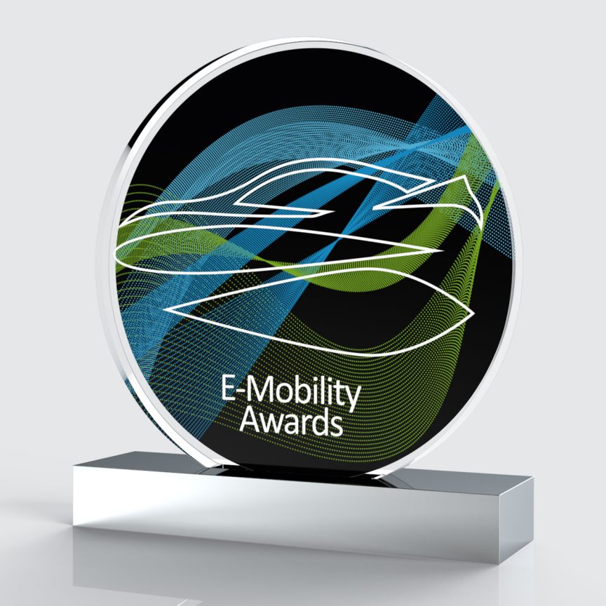 The trophies for E-Mobility Awards winners were created from digitally printed clear acrylic, with bases in nickel or gold plated aluminium with laser engraving.