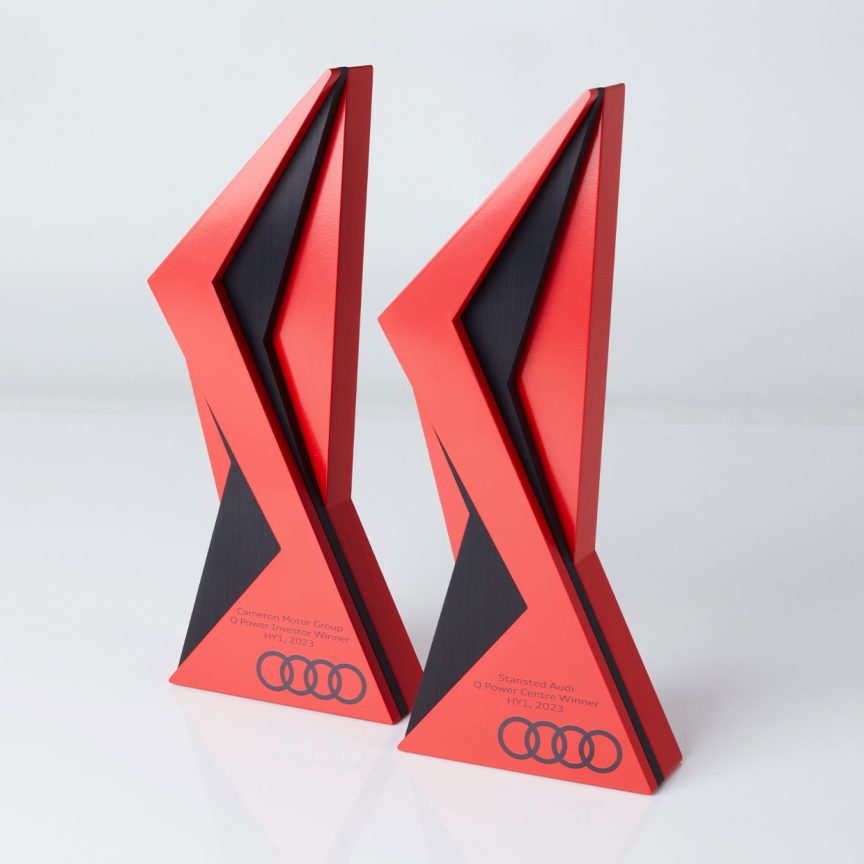 A slick car brand needs a slick award to match. This striking design is made from solid aluminium for that desirable weighty feel and given a matt red paint finish with black anodised layers and detailing. The layered effect creates dimension and depth. It received great feedback from the winners and other employees – ‘Q power trophy looks on point’ and here at EFX we agree it ‘looks very slick’.