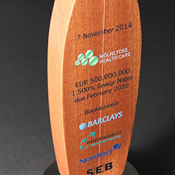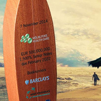 In the world of corporate finance, the successful conclusion of a major deal involving several parties is sometimes marked with the presentation of tombstones to key players involved. You can imagine that some CEOs and Bankers have quite a collection. Recently, Barclays Bank got in touch with EFX to commission a bespoke tombstone; the design had to appeal to the CEO of a Swedish healthcare company who loves surfing.