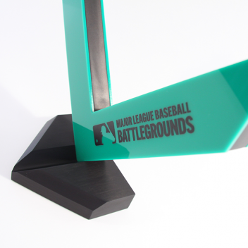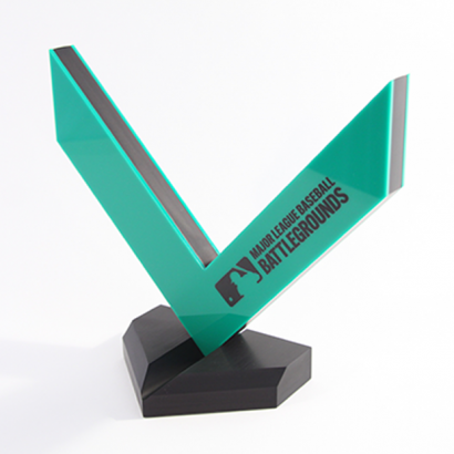 With DJ’s blasting out tunes and Colin Murray giving a running commentary,the players took to the stage andstarting smashing balls out – the crowd were given mitts and allowed to keep any balls they caught! Imagination (London)organised the MLB Battlegrounds eventand commissioned a suitably prestigious and British-made trophy for the winning team. Created by Special EFX, the ‘V’ shaped trophy was manufactured in polished black anodised aluminium and decorated in green acrylic, and reinforced the MLB Battleground branding of the entire event. The Los Angeles Dodgers won on the day and took the trophy back home to the U.S.