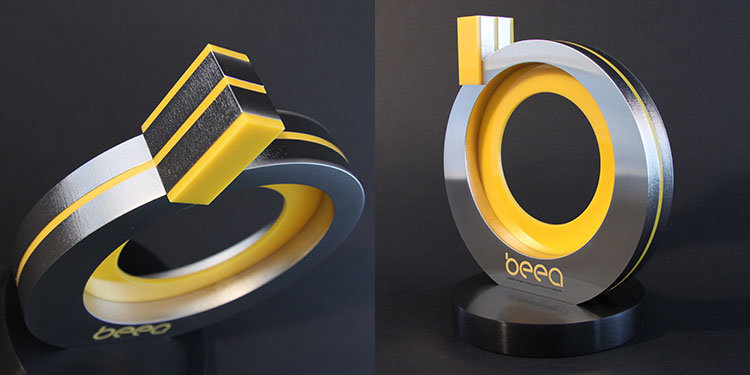 The design selected majors on the “B” of the BEEA logo, achieved in brushed nickel plated aluminium, with an inner yellow, acrylic centre and standing on an anodised aluminium plinth. The graphics feature a combination of digital printing and laser engraving – precisely applied to the surface of the plinth. The resulting trophies realised the client’s brief: “The British Engineering Excellence Awards are well respected within the industry and the award has to match our guests’ expectations. The final design provided a high quality, prestigious award that the winners were proud to receive”.