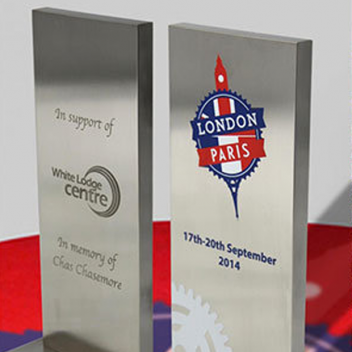These digitally printed, brushed aluminium charity awards are for a challenge which will see a team of cyclists led by Ray Phillpott set off from London for Paris, on 17th September, to raise funds for the White Lodge Centre in Surrey. This is the fourth year the team has got together to raise funds for charity, in memory of a dear friend, Charles Chasemore, who died in 2010. This year the intrepid team has acquired a bit of additional inspiration for when the going gets tough – Rachel Morris, the Double World Champion and winner of the gold and bronze medals in two Paralympics for Handcycling is joining them. So, no excuses team when you experience le mal aux fesses (I just love the official translation for this which is ‘evil butt’!).