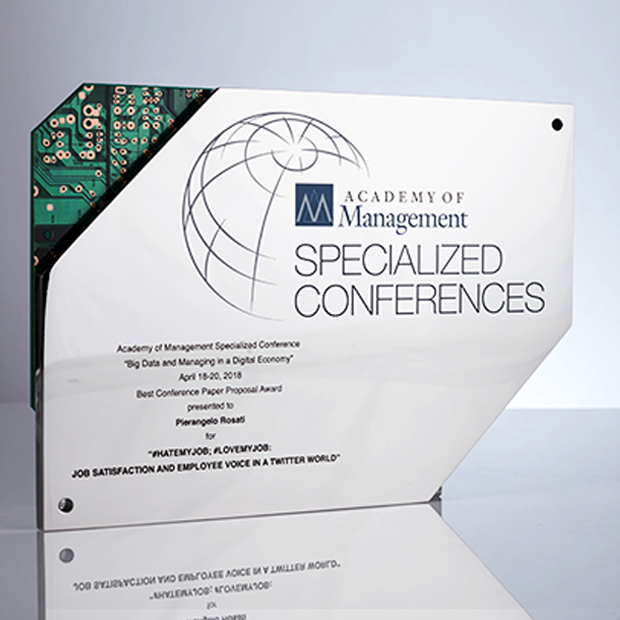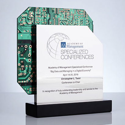 The business awards recently manufactured by EFX for the Academy of Management (AOM) are a perfect illustration of how a trophy design can be strategically used to reinforce the theme of an event. In this case, the occasion was the AOM’s first specialized conference hosted in April by the University of Surrey: Big Data and Managing in a Digital Economy and the awards each featured a correlating section of a circuit board.