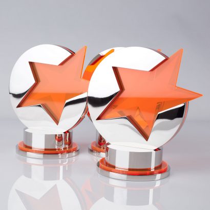 EFX likes to add its own star quality to all the trophies and awards it makes. Every single one is designed to look truly special and worthy of a winner. This recently-manufactured 5 star trophy design, featuring vibrant orange acrylic and polished nickel plate, is a perfect example. The client requested a star-like design to reflect the logo of its internal development programme − EFX took the concept and turned it into a powerful, contemporary design that oozes star-quality, exclusive appeal and strong branding.