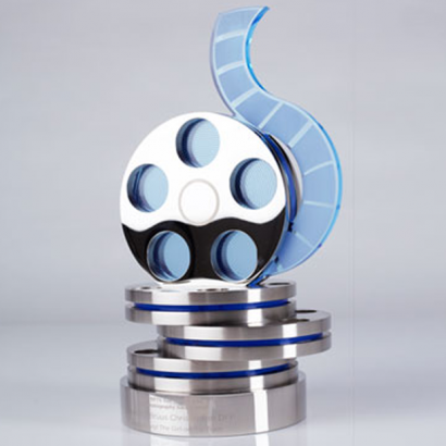 The symbolism of the film reels is immediate, whilst the fluidity of line and sense of motion incorporated into the trophy tells a story. The award is manufactured with precision engineering, successfully combining the power of polished nickel plated aluminium with the distinctive, decorative accents of blue acrylic. The trophy stands an impressive 330mm tall; it comprises 13 individual components and features subtle laser engraved detailing and personalisation.