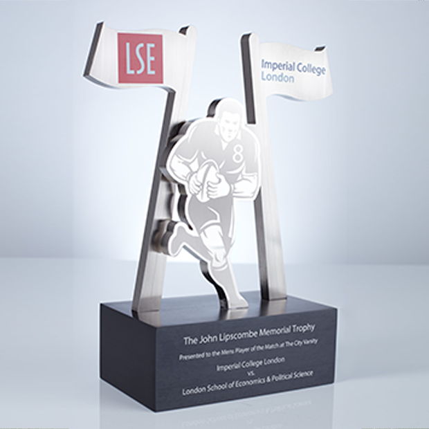 The John Lipscombe Memorial Trophy is named after John Lipscombe, who studied at both universities in the early 1960s, rowed for ICL and played rugby on both sides. Oliver Marsden of the LSE team earned the accolade of Men’s Player of the Match and was presented with the newly created trophy, made by EFX. The design, which so powerfully portrays the key elements of the game features an attacking rugby player, ball in hand and the rugby posts behind him, and is made in brushed nickel plated aluminium with a contrasting, black anodised base. The finer details are achieved with digital printing and laser engraving.