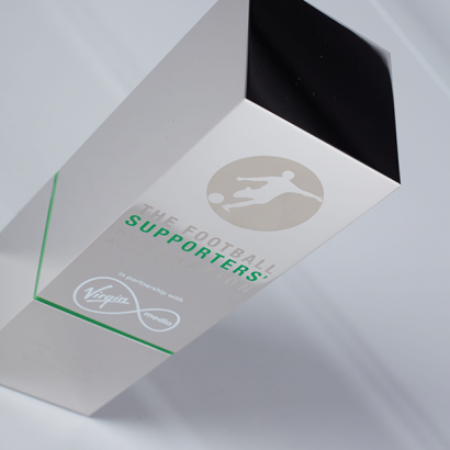 The exclusive awards, manufactured by EFX, are made in solid aluminium and nickel-plated to produce a mirror-finish and the design is sliced through with a contrasting layer of vivid green acrylic. The Football Supporters’ Federation logo is laser engraved, whilst the Virgin logo is achieved with high-quality digital printing.
