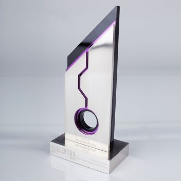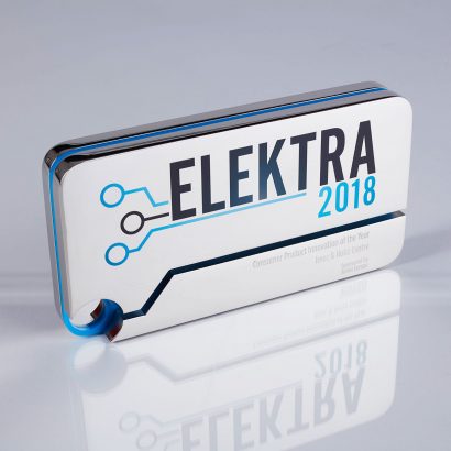 The latest trophy design for the Elektra Awards stands 23.5cms tall and suggests its electronic industry credentials with the use of a digitally printed mirror and globe, which are featured on the face of the trophies.