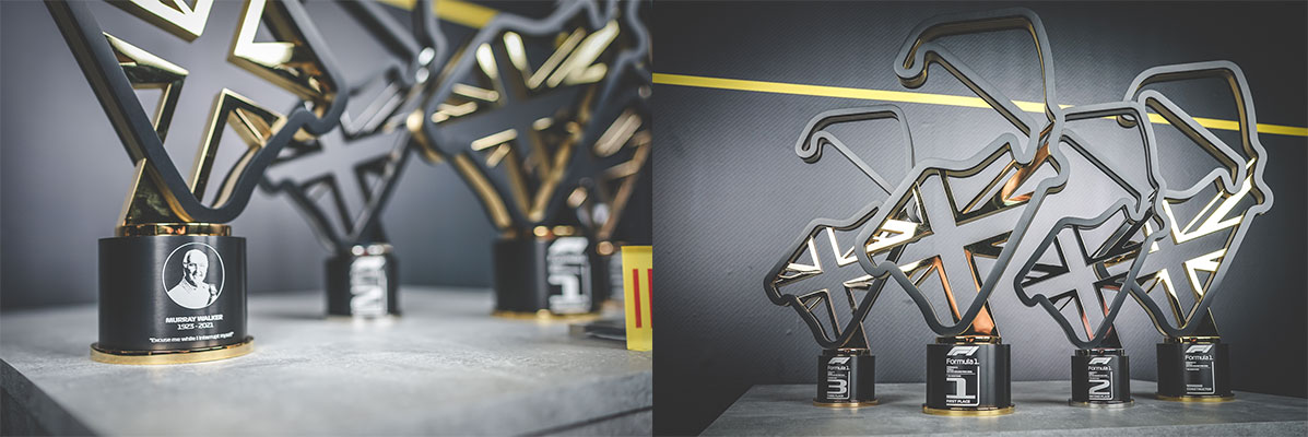 The matt black anodised aluminium trophy base was engraved with an image of Murray Walker, a legend in motorsport commentating, as a very special tribute to him. What left the EFX manufacture was no less than a masterpiece. Fit for the Formula 1 Pirelli British Grand Prix podium!