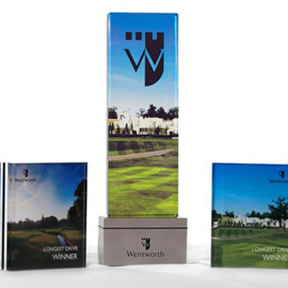 For some commissions, we take a club’s emblem or logo and etch or print it onto a series of golf trophies; each one is then individually engraved with the winners’ details – these are ideal for annual club competitions. For other commissions, we capture on acrylic or glass a full colour, high quality photo, such as an attractive view of a clubhouse or perhaps a scenic shot of a green; this is a particularly effective way to promote a club to visitors and these plaques are equally popular as corporate gifts as they are winners’ trophies. For major tournaments we create bespoke golf trophies and cups, often in a fabulous mirror finished, nickel plated aluminium; these cups are designed to reflect the specific event and sponsors and to look suitably impressive at the official presentation.