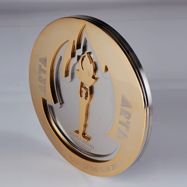 The custom trophy plaques designed and manufactured by Special EFX are distinctive in design and imposing. The focus of the design is Arta’s statuesque chef emblem, revealed in gold in the centre and surrounded by a double frame of solid aluminium, personalised and engraved. The lavishness of the gold plate differentiates the different category of winners.