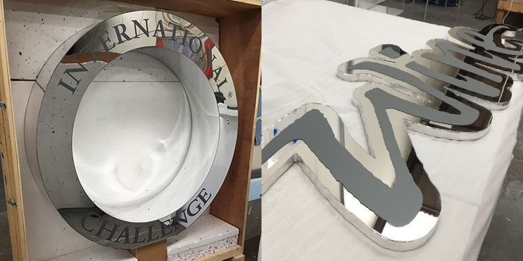 The three IWC giant awards were manufactured from a combination of rigid and flexible MDF and clad in a mirror-finished acrylic, printed with the IWC logo. As with the metal trophies, each of the mega-sized versions were constructed as three components, ring, text and angled plinth, and precision-cut on a CNC driven router. The final, assembled logos are mounted on castors.