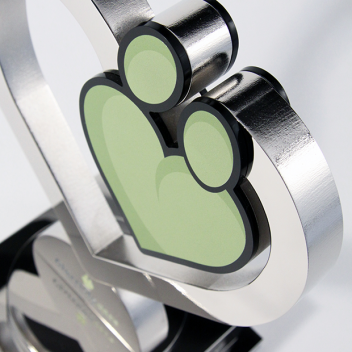 The original brief for the trophy stated that the Franchisee of the Year Award should look striking in publicity photos and reflect the Clarriots Home Care brand. The EFX studio responded with a reversible, heart inspired design which was then produced in polished nickel plated aluminium and decorated in acrylic to mirror the brand palette. The three-tier plinth adds perceived value to this perpetual trophy and provides a suitable location for magnetic name plates for recording the winners’ names in years to come.