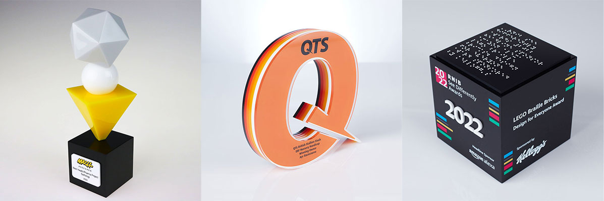 And there’s also a midpoint between the two – off the shelf acrylic awards that come in set designs, but can easily be personalised with digital printing and laser engraving.