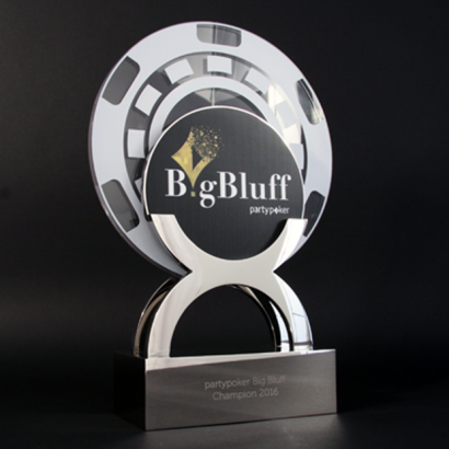 Standing a magnificent 40 cm tall and featuring a stylised poker chip in polished nickel plate and crowned with the Big Bluff branding printed on clear acrylic, the trophy certainly made the right impression. Elated to be “number one” Carl explained in an interview afterwards that:  “The trophy is going to take pride of place in the house”.