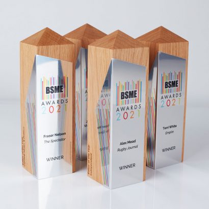 The interactive virtual event started with a unique cocktail making class. The cocktail, ‘Wench 75’ created by Portia Freeman, was inspired by the timeless cocktail, the ‘French 75’, which complimented our award with an introduction from Laura Whitmore – ‘A huge Thank You to the team at EFX for kindly designing and supplying these little beauties! Just what everyone’s mantlepiece needs.’ Winning one of these BSME awards is the pinnacle of every editor’s wish list, and we can of course see why! They received these striking angular oak and polished aluminium awards, featuring the society’s colourful logo printed onto the metal. A strong brand to stand out on their mantlepiece.