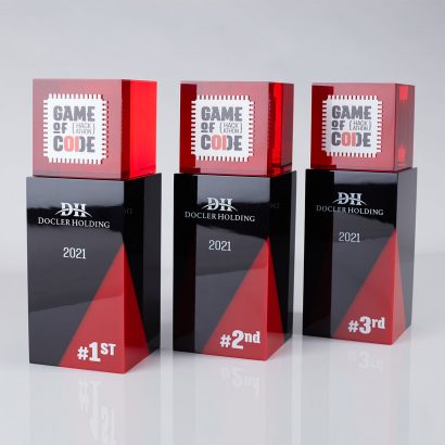 It was time to embrace pressure and get stuck in. The stakes were high: pride, prestige, a serious amount of prize money and of course the EFX trophies for the top three placed teams for each challenge. EFX custom-designed and produced the trophies specifically for the Game of Code 2021 competition. The stepped pillar design is capped with a translucent red acrylic cube, meticulously laser cut to reveal a notched-edge, whilst the white background is digitally printed with the event’s logo. In contrast, the solid red and black, cast acrylic pillar standing underneath is screen printed.