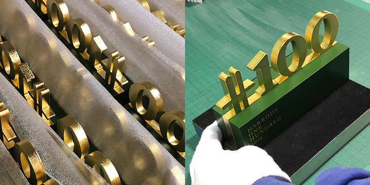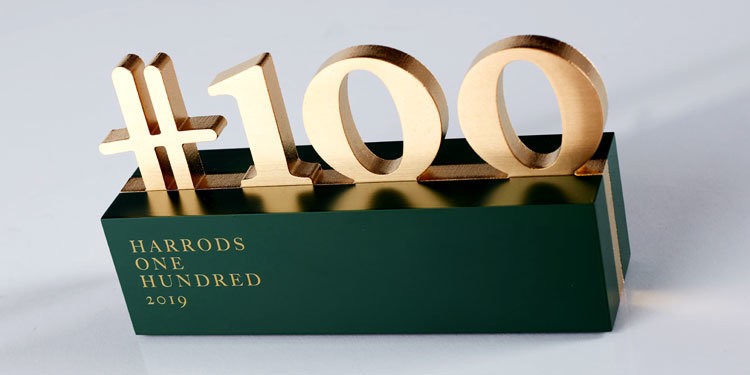The design this year is a contemporary take on the ‘H100’ or Harrods One Hundred graphics. It features the Harrods ‘H’ in the style of a hashtag, giving the awards a topical and contemporary appeal. Manufactured from waterjet-cut, solid aluminium, each was finished in an exclusive layer of brushed gold plate and mounted on a podium finished in the famous Harrods’ green.