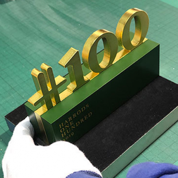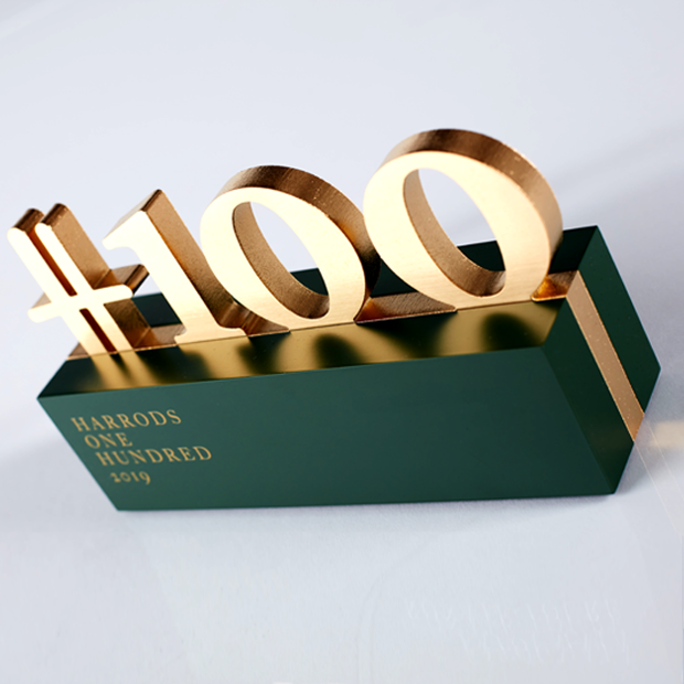 The design this year is a contemporary take on the ‘H100’ or Harrods One Hundred graphics. It features the Harrods ‘H’ in the style of a hashtag, giving the awards a topical and contemporary appeal. Manufactured from waterjet-cut, solid aluminium, each was finished in an exclusive layer of brushed gold plate and mounted on a podium finished in the famous Harrods’ green.