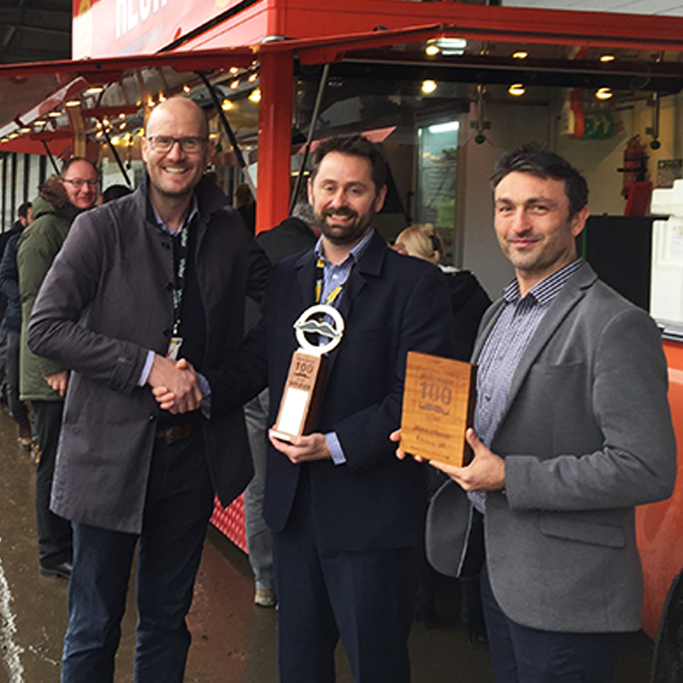 Finning UK were the ultimate winners for 2017, raising an impressive £21,274. The presentation photograph, shown here, complete with macho trophy is not your typical PR shot, featuring as it does a Heck Sausage outlet…however, the latter is evidently one of Movember’s corporate supporters and worthy of a mention.  Each of the 14 teams that topped £10,000 were likewise awarded an EFX-produced Movember Top 100 Club trophy, made in iroko and laser engraved.