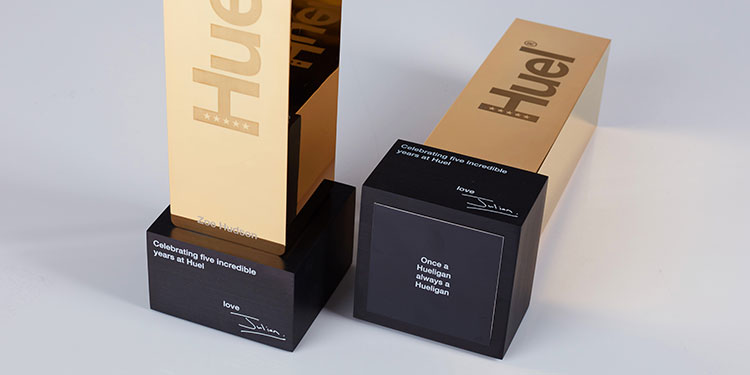 One of the great benefits of commissioning a bespoke trophy from EFX is that you can request no end of unique features, which can make the trophy all the more treasured by the recipients. Huel, the innovative, nutritionally complete food company, made full use of this facility for the internal long service trophies it recently commissioned from EFX.