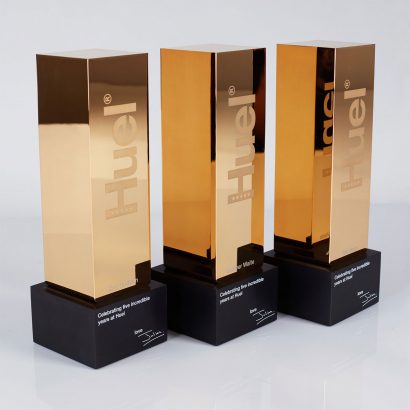 The company elected for a column trophy design that is made from solid aluminium: they are impressive in weight and have impact in form. The gleaming finish is gold plate for the column and in a contrasting black for the anodised plinth. The winner’s name is engraved on each one whilst the personal message and signature of Julian Hearn, the founder of the business, is printed in white. Meanwhile, on the underside of the base a special dictum of the Huel business reads: “Once a Hueligan always a Hueligan”.