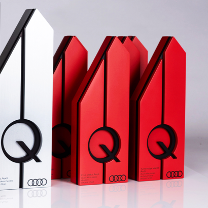 Three sizes and three colours of award, clearly differentiate the 2020 categories and levels of recognition. The largest, awarded to the Audi Centre of the Year, stands 380mm tall. The innovative design of the Audi Q Power Awards is manufactured in matt finished, anodised aluminium and constructed from four shaped sections featuring bold graphics, including the iconic Audi branding. Presented in a branded, black presentation box, the individual trophies were shipped direct to the winners, in time for the national, virtual presentation event.