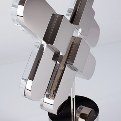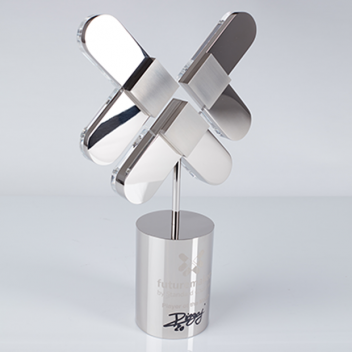The iconic trophy stands 400mm tall and is fabricated from polished nickel plated aluminium combined with clear acrylic, decorated with brushed nickel plated aluminium diamonds and laser engraved.