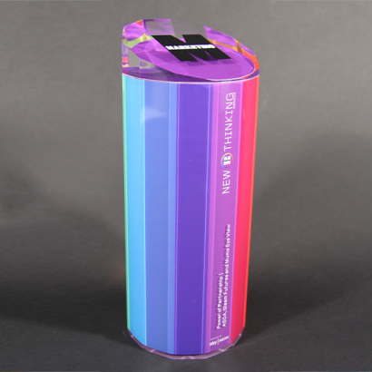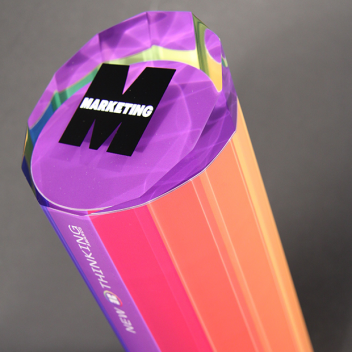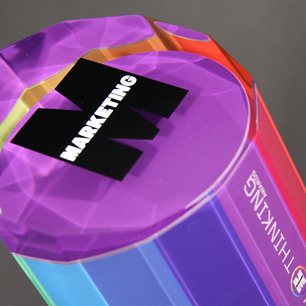 The resulting ‘dodecagon’ cast acrylic trophies – yes, we do mean 12 sided – are a first for EFX. The novel design pushed the accepted boundaries of production and then involved diligent hand polishing to maintain consistency of the angles; the eye-catching colour gradation is achieved internally, whilst the logo is surface screen printed for added prominence.