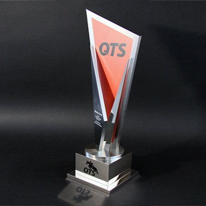 The winner’s trophy stands over 37cm tall and is made in nickel-plated aluminium, printed with the bold QTS logo in orange and black with the event details crisply engraved on the face.
