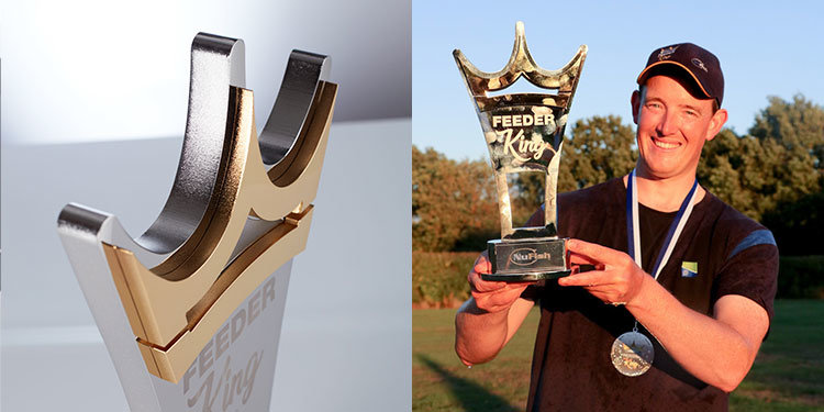The Feeder King fishing trophy stands an impressive 390mm tall and is regal in design, featuring a stylised crown mounted on a podium plinth. Manufactured in solid aluminium with pierced detailing, it has a pristine nickel-plated, mirror finish and is decorated with gold plate and engraved. Complementing medals were likewise produced by EFX as a lasting souvenir for the winner.