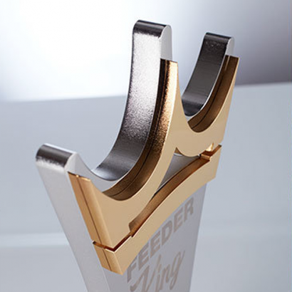 The Feeder King fishing trophy stands an impressive 390mm tall and is regal in design, featuring a stylised crown mounted on a podium plinth. Manufactured in solid aluminium with pierced detailing, it has a pristine nickel-plated, mirror finish and is decorated with gold plate and engraved. Complementing medals were likewise produced by EFX as a lasting souvenir for the winner.