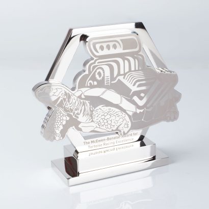 This wonderfully quirky trophy was created in polished nickel plated aluminium, with a beautifully engraved design of a tortoise with an engine strapped to its shell.