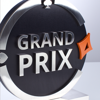 EFX creates trophies of all sorts of designs, shapes and sizes and the partypoker Grand Prix trophy falls into the mega category – fitting for such an event. It stands 320mm tall and 290mm wide. Manufactured in brushed nickel plate, the striking black surface design is achieved by anodising the metal, whilst the all-important orange card motifs of the club and heart are painted onto the trophy.