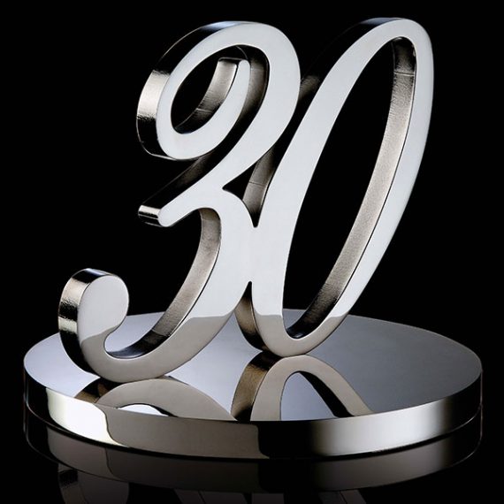 Stunning profiled table centre celebrating a 30 year anniversary. Manufactured in polished nickel plated aluminium with a round base.