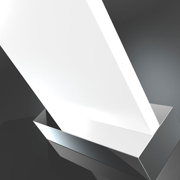 Rectangular award in black or white Acrylic with a polished nickel plated aluminium base. Each piece can be personalised with laser engraving or printing of your logo and winner text.