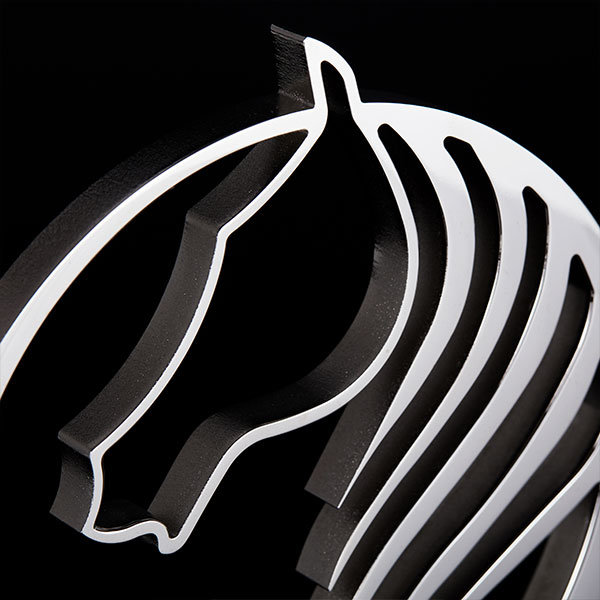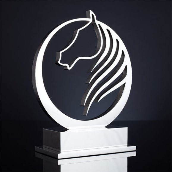 Intricately pierced horse in polished nickel plated aluminium with a rectangular stacked base.