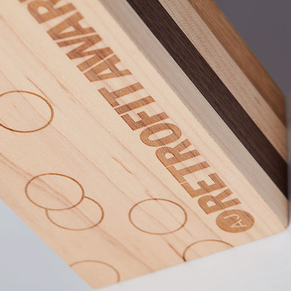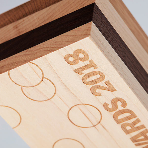 Environmentally friendly layered wooden blocks with engraved and printed detail.