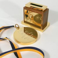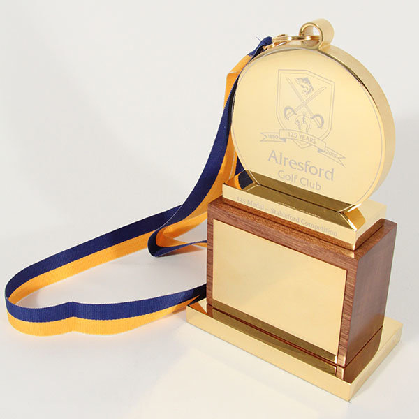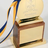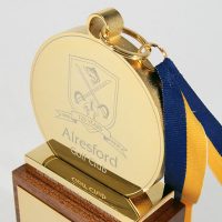 Polished gold plated aluminium supersized medal slotted into a tiered gold and natural wood base to form an impressive bespoke award.