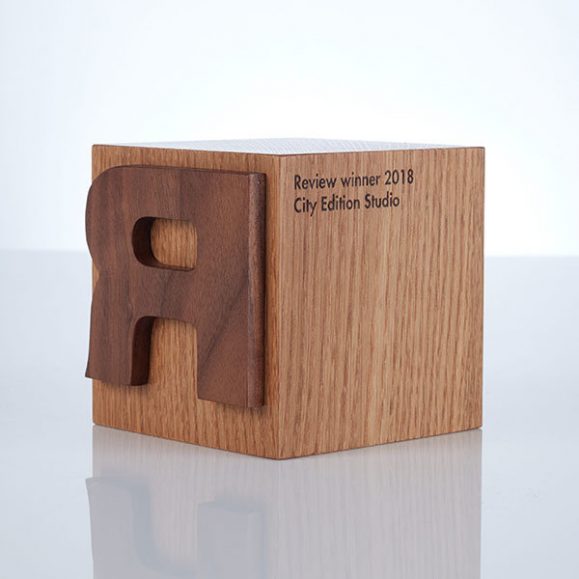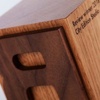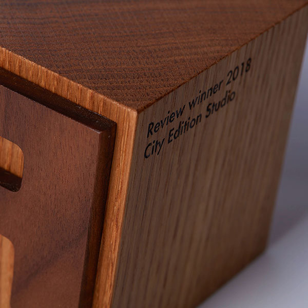 Eye-catching sustainable wooden block award with engraved detail.