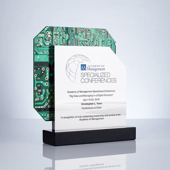 Distinctive layered award created using recycled circuits boards and polished nickel plated aluminium combined with a black wood base.