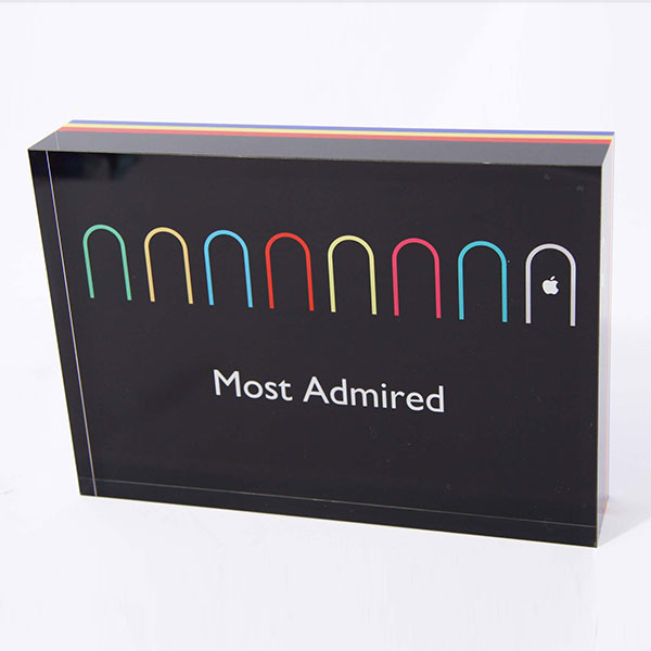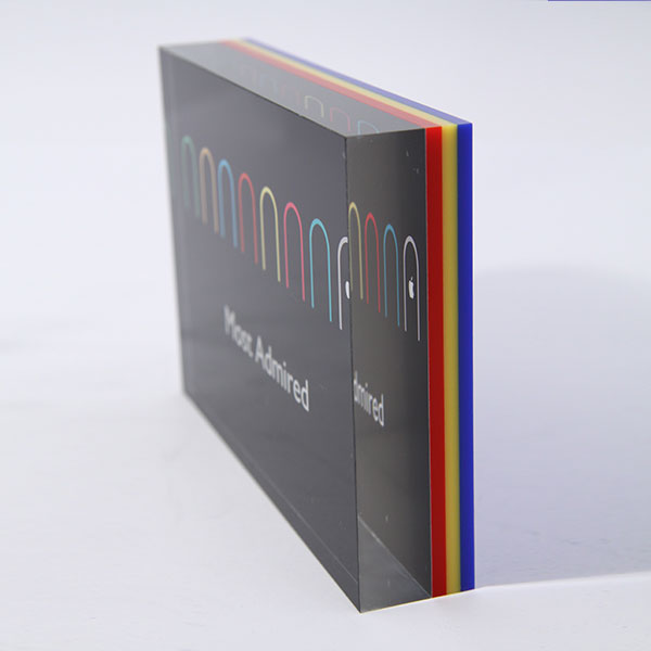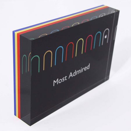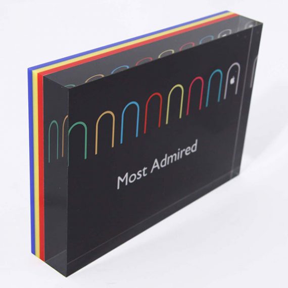 Distinctive layered acrylic award with three layers of primary coloured acrylic and bold internally printed graphics.