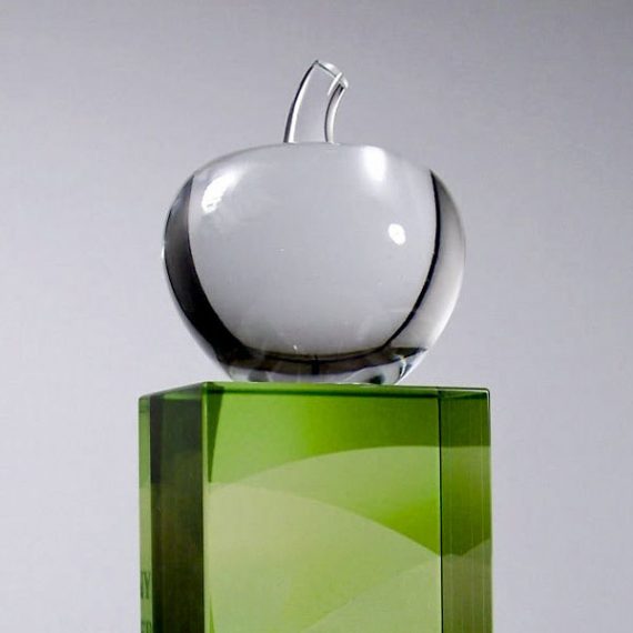 Beautiful three dimensional apple, cast in glass and mounted onto a printed glass tower base.