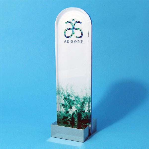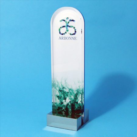 Profiled acrylic award with eye-catching, colour print and blue acrylic backing. Combined with a polished nickel plated aluminium base to form this stunning award.