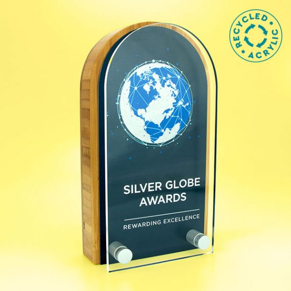 Oblong trophies in a choice of four sizes and three mellow woods: oak, cherry and bamboo with front panel in mirror-finished metal and recycled acrylic. Responsibly sourced, individually unique and 100% recyclable.