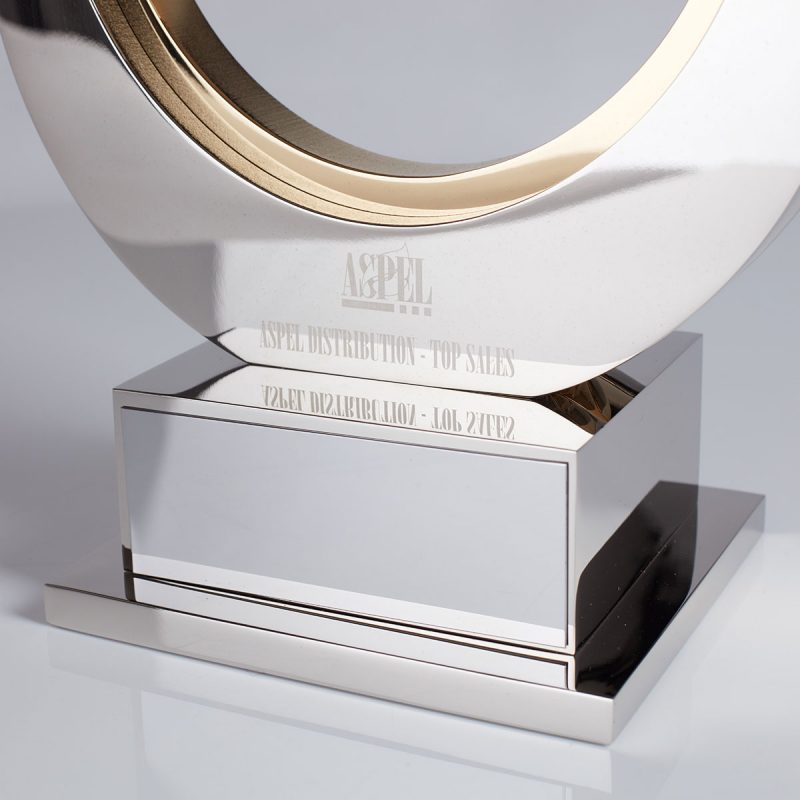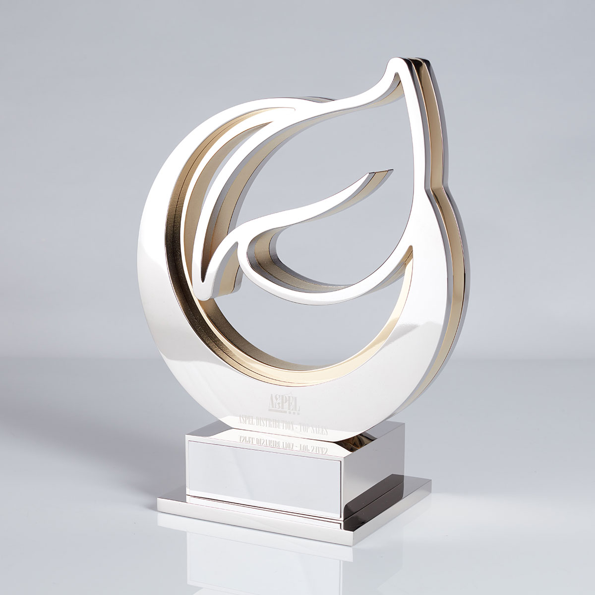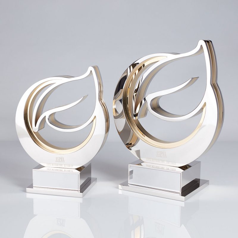 This water droplet design oozes style and is certainly commensurate recognition for outstanding performance. Standing 300mm tall, it captures the graceful silhouette of the water droplet and is achieved in pierced, polished nickel plated aluminium intersected by a layer of gold (plate).
