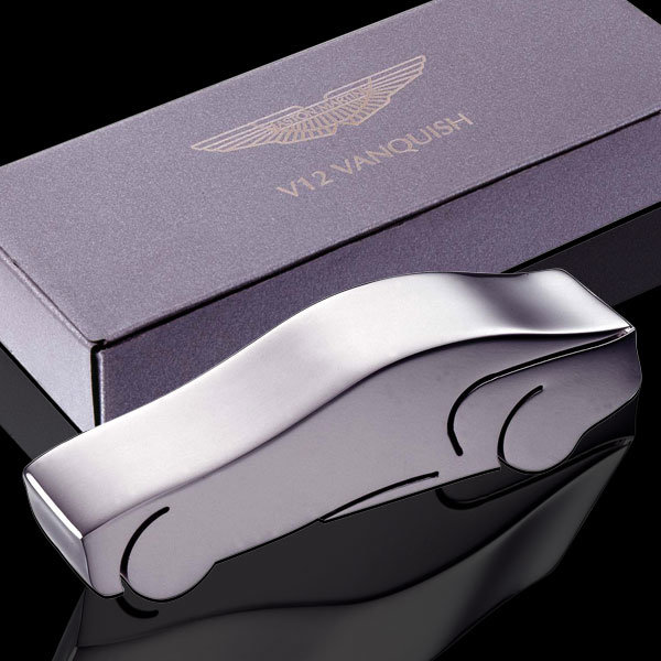 Intricately pierced Aston Martin paperweight in polished nickel plated aluminium.