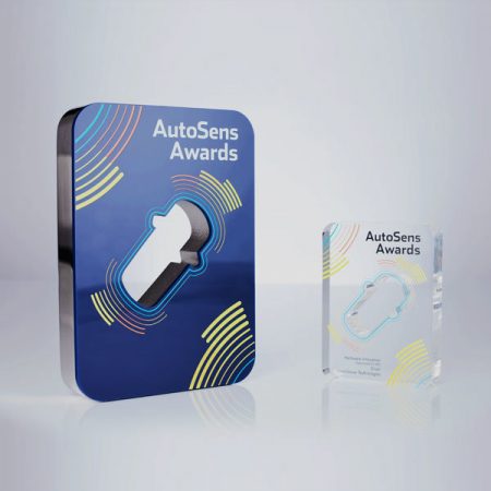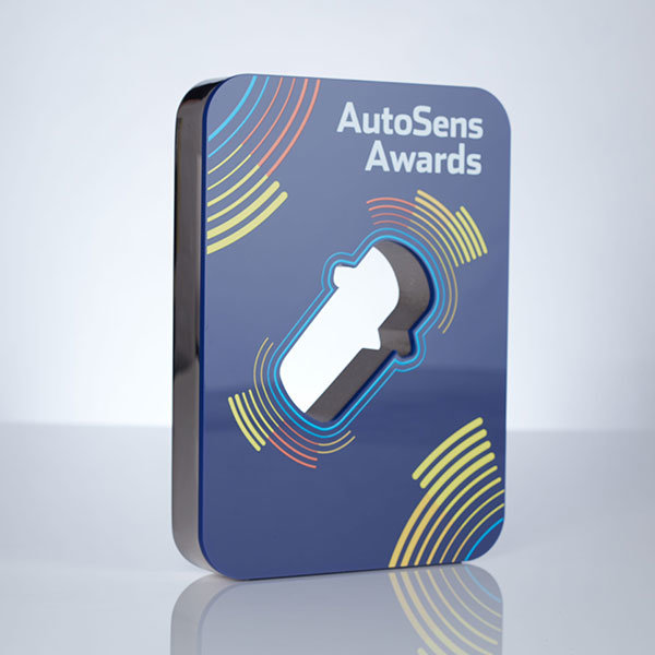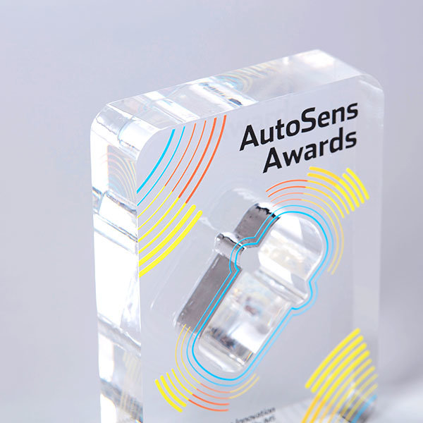 High Profile pierced car in polished nickel plated aluminium and acrylic, with a miniature acrylic version. Each award is personalised by printing directly onto the award.