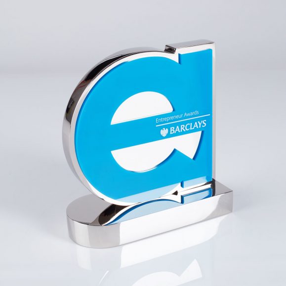 Eye-catching polished nichel plated aluminium award with blue acrylic branding.