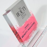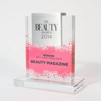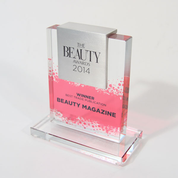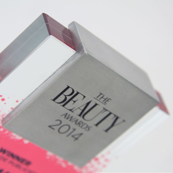 Bespoke brushed aluminium and glass award with bold full colour print.
